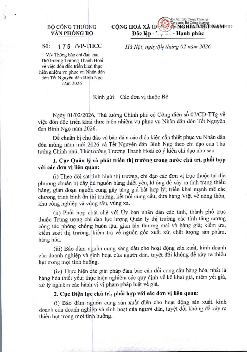 | Tiêu đề văn bản | Công văn về Thông báo chỉ đạo của Thứ trưởng Trương Thanh Hoài về việc đôn đốc triển khai thực hiện nhiệm vụ nhân dân đón Tết Nguyên đán Bính Ngọ năm 2026 | ||
