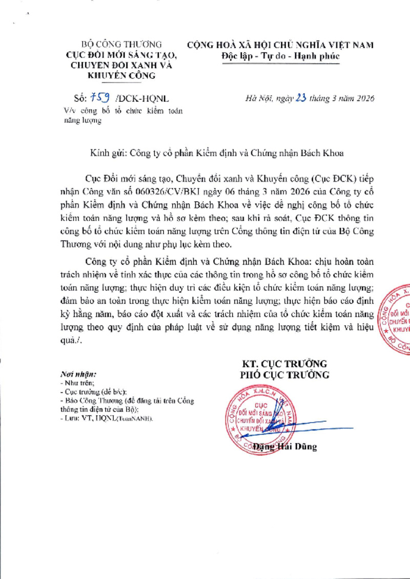 | Số hiệu | 759/ĐCK-HQNL | Cơ quan ban hành | Cục Đổi mới sáng tạo, Chuyển đổi xanh và Khuyến công |