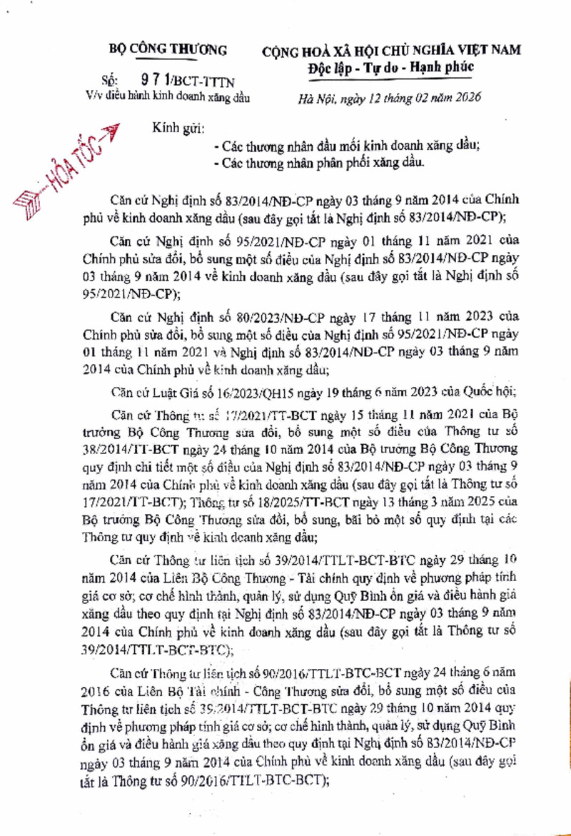 | Tiêu đề văn bản | Công văn về việc điều hành kinh doanh xăng dầu ngày 12/2/2026 | ||