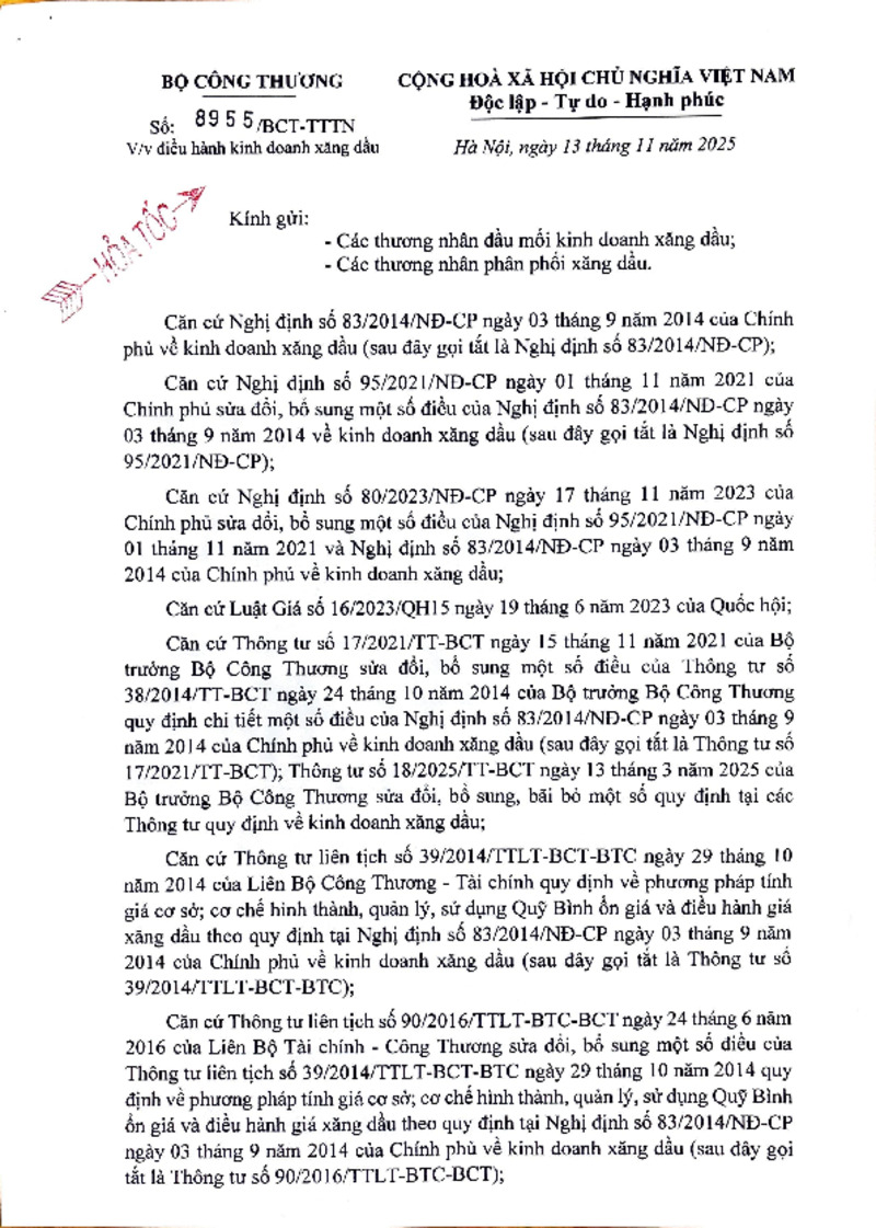 | Tiêu đề văn bản | Công văn về việc điều hành kinh doanh xăng dầu ngày 13/11 | ||