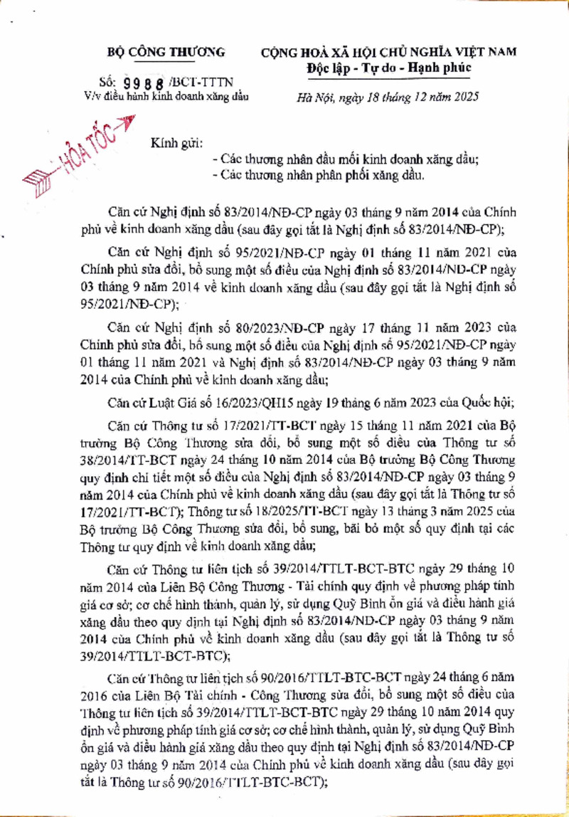 | Tiêu đề văn bản | Công văn về việc điều hành kinh doanh xăng dầu ngày 18/12 | ||