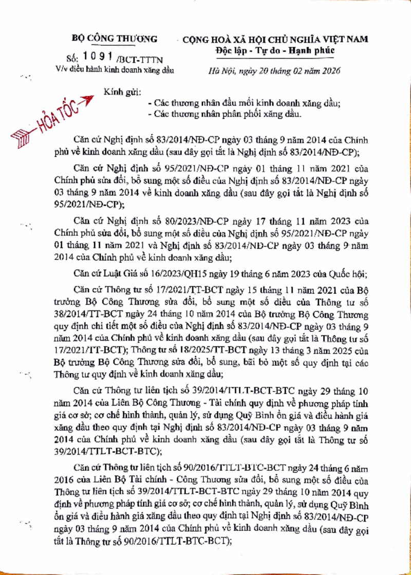 | Tiêu đề văn bản | Công văn về việc điều hành kinh doanh xăng dầu ngày 20/2/2026 | ||