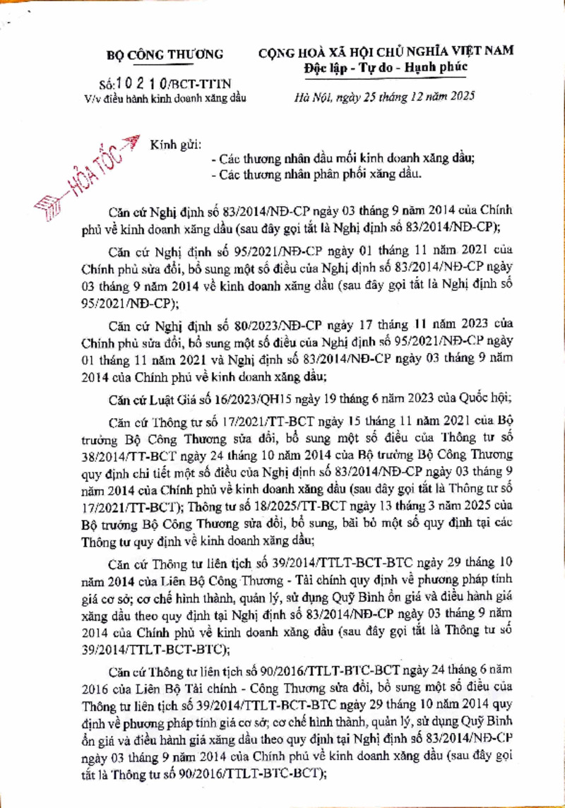 | Tiêu đề văn bản | Công văn về việc điều hành kinh doanh xăng dầu ngày 25/12 | ||