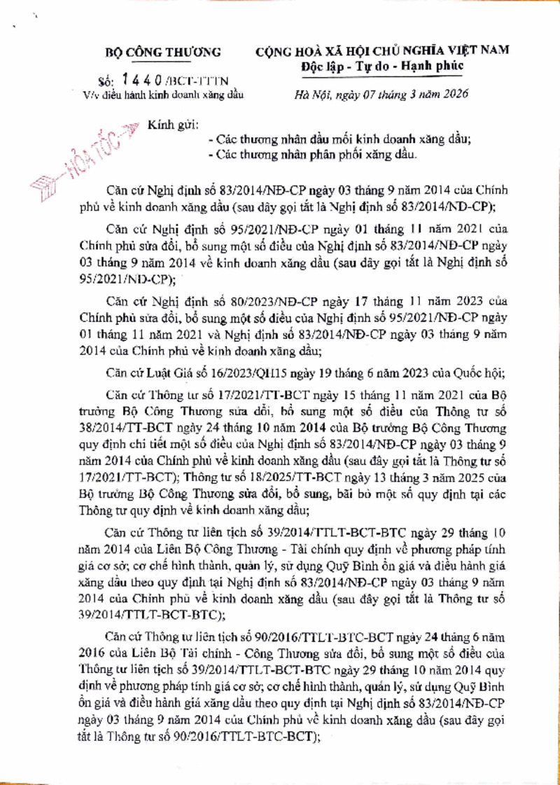 | Tiêu đề văn bản | Công văn về việc điều hành kinh doanh xăng dầu ngày 7/3/2026 | ||