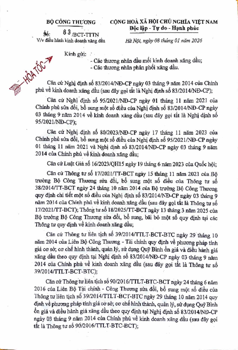 | Tiêu đề văn bản | Công văn về việc điều hành kinh doanh xăng dầu ngày 8/1/2026 | ||