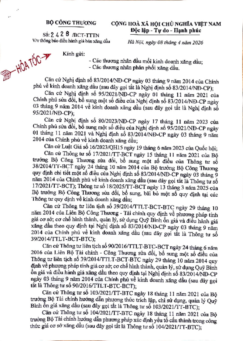 | Tiêu đề văn bản | Công văn về việc điều hành kinh doanh xăng dầu ngày 8/4/2026 | ||