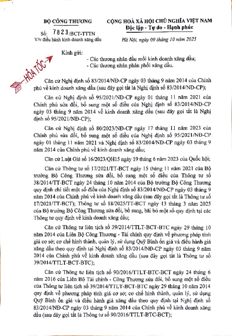 Tiêu đề văn bản | Công văn về việc điều hành kinh doanh xăng dầu ngày 9/10 | ||