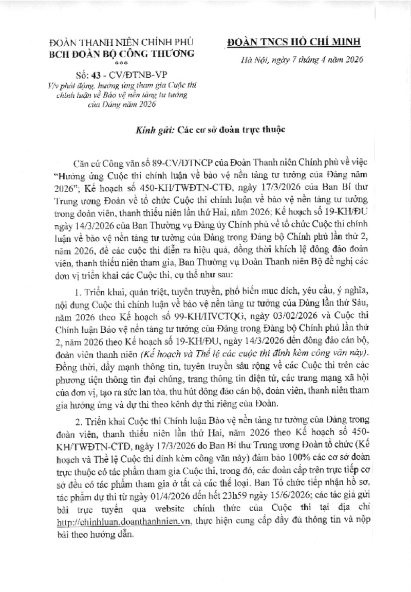 | Số hiệu | 43-CV/ĐTNB-VP | Cơ quan ban hành | BCH Đoàn Bộ Công Thương |