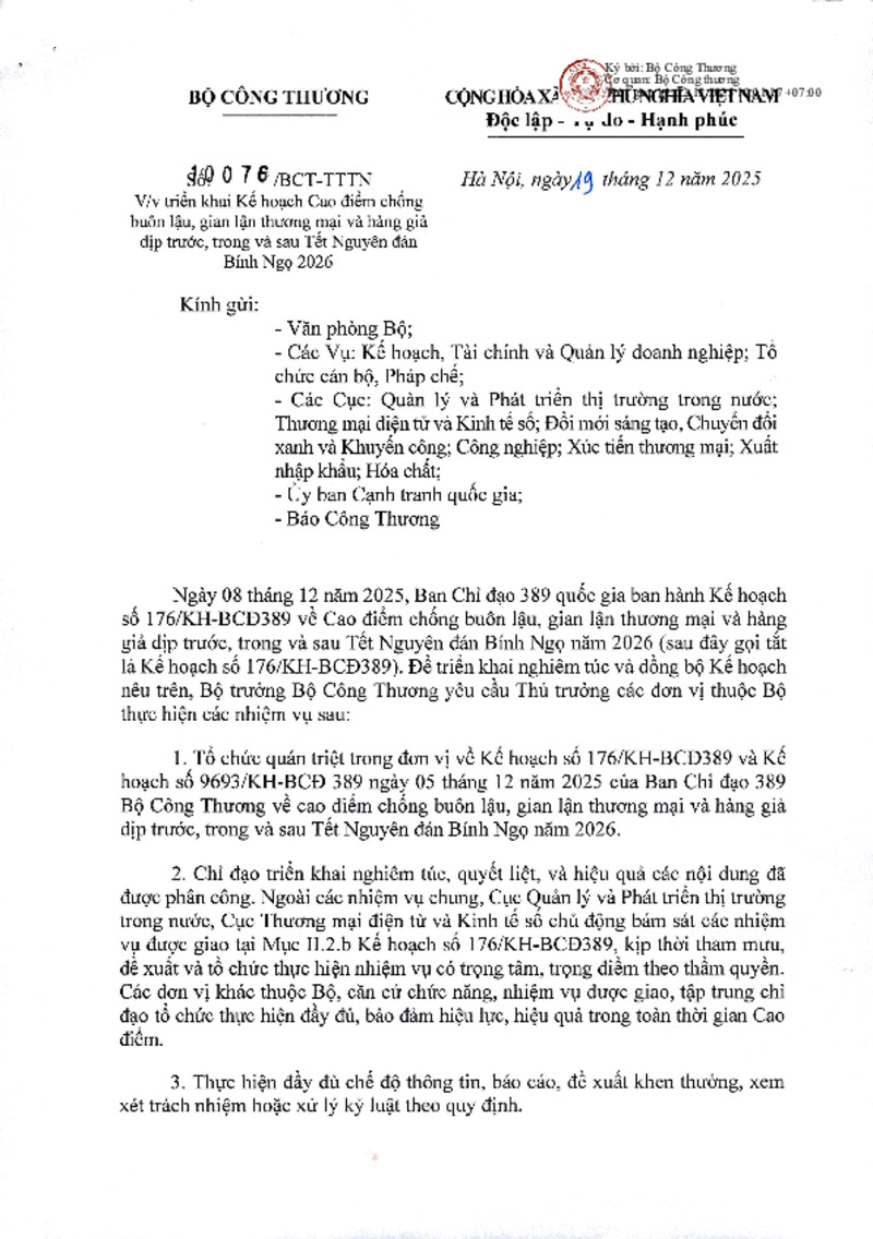 | Tiêu đề văn bản | Công văn về việc triển khai Kế hoạch cao điểm chống buôn lậu, gian lận thương mại và hàng giả dịp trước, trong và sau Tết Nguyên đán Bình Ngọ 2026 | ||