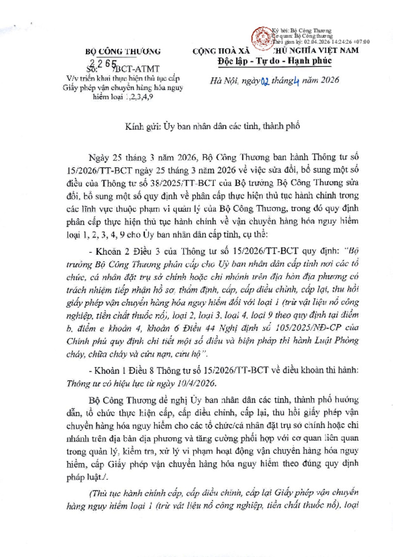 | Số hiệu | 2265/BCT-ATMT | Cơ quan ban hành | Bộ Công Thương |