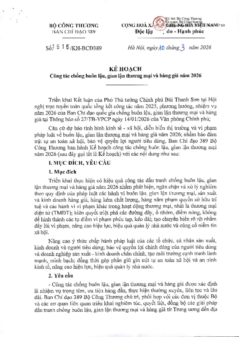 | Số hiệu | 1515/KH-BCĐ389 | Cơ quan ban hành | Bộ Công Thương |