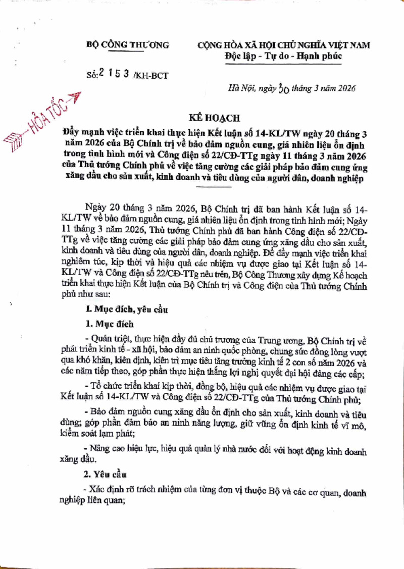 | Tiêu đề văn bản | Kế hoạch đẩy mạnh triển khai thực hiện Kết luận số 14-KL/TW ngày 20/3/2026 của Bộ Chính trị về bảo đảm nguồn cung, giá nhiên liệu ổn định trong tình hình mới và Công điện số 22/CĐ-TTg về tăng cường các giải pháp bảo đảm cung ứng xăng dầu | ||