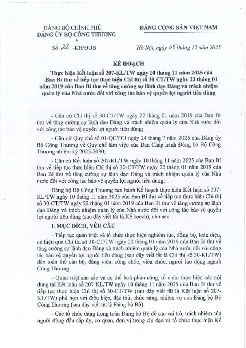 | Tiêu đề văn bản | Kế hoạch Thực hiện Kết luận số 207-KL/TW ngày 10/11/2025 của Ban Bí thư về tiếp tục thực hiện Chỉ thị số 30-CT/TW ngày 22/01/2019 của Ban Bí thư về tăng cường sự lãnh đạo Đảng và trách nhiệm quản lý của Nhà nước đối với công tác bảo vệ quyền lợi người tiêu dùng | ||