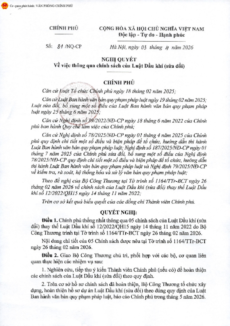 | Tiêu đề văn bản | Nghị quyết về việc thông qua chính sách của Luật Dầu khí (sửa đổi) | ||