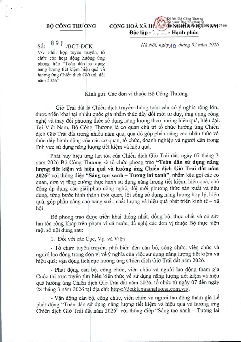 | Số hiệu | 891/BCT-ĐCK | Cơ quan ban hành | Bộ Công Thương |