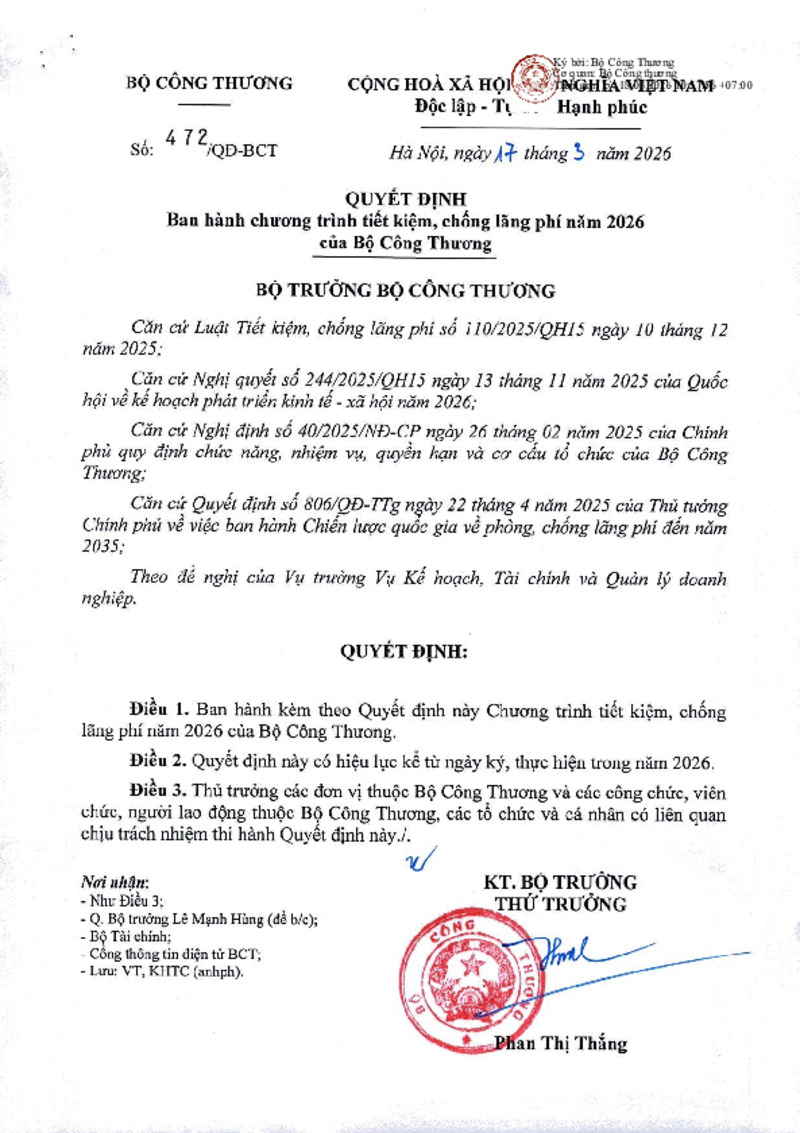 | Tiêu đề văn bản | Quyết định Ban hành chương trình tiết kiệm, chống lãnh phí năm 2026 của Bộ Công Thương | ||