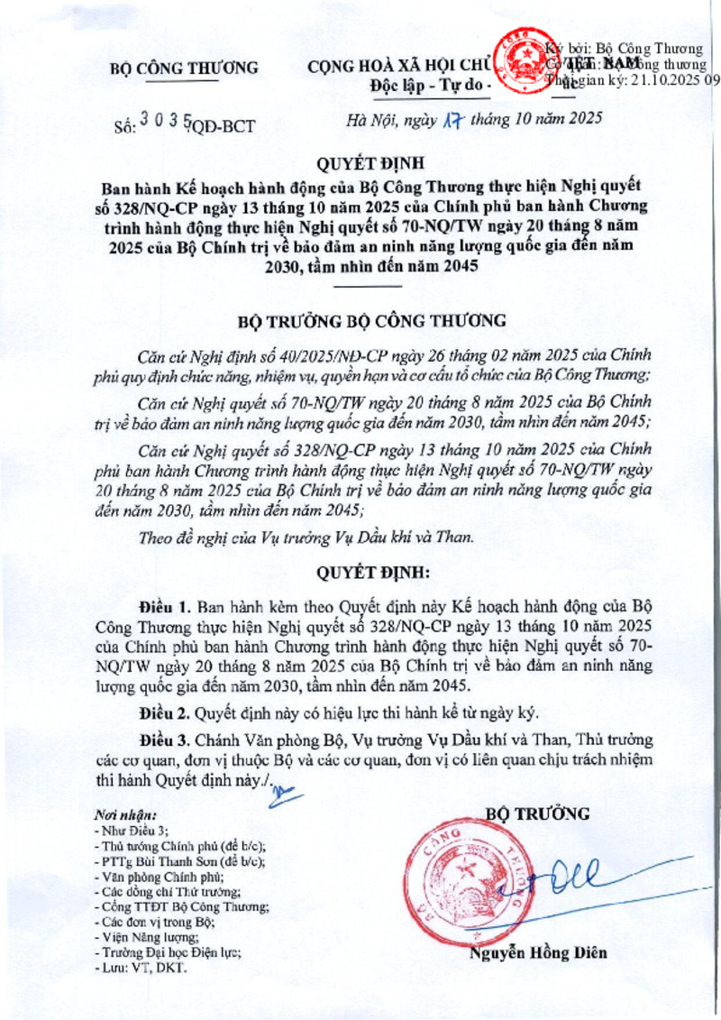 | Tiêu đề văn bản | Quyết định ban hành Kế hoạch hành động của Bộ Công Thương thực hiện Nghị quyết số 328/NQ-CP ngày 13 tháng 10 năm 2025 của Chính phủ ban hành Chương trình hành động thực hiện Nghị quyết số 70-NQ/TW ngày 20 tháng 8 năm 2025 của Bộ Chính trị về bảo đảm an ninh năng lượng quốc gia đến năm 2030, tầm nhìn đến năm 2045 | ||