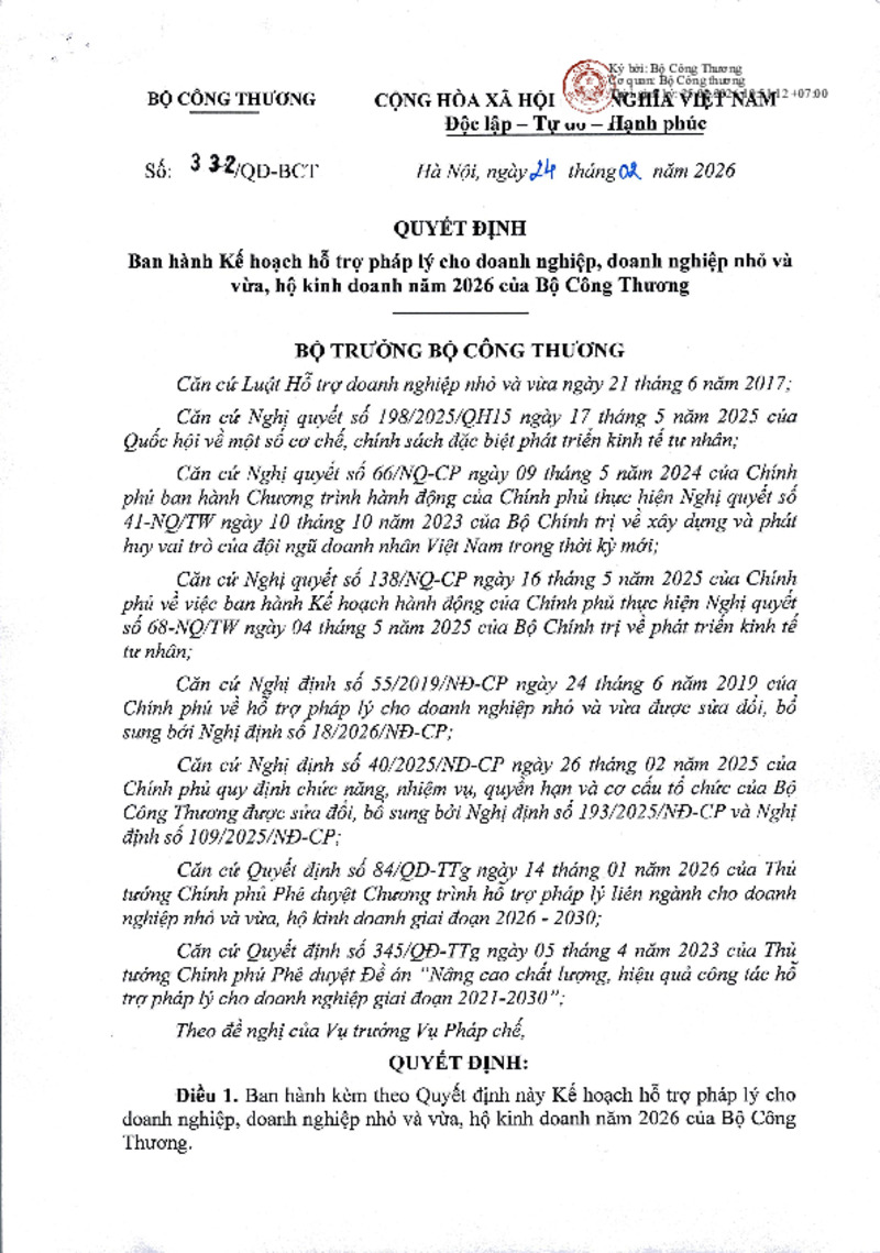 | Tiêu đề văn bản | Quyết định ban hành Kế hoạch hỗ trợ pháp lý cho doanh nghiệp, doanh nghiệp nhỏ và vừa, hộ kinh doanh năm 2026 của Bộ Công Thương | ||