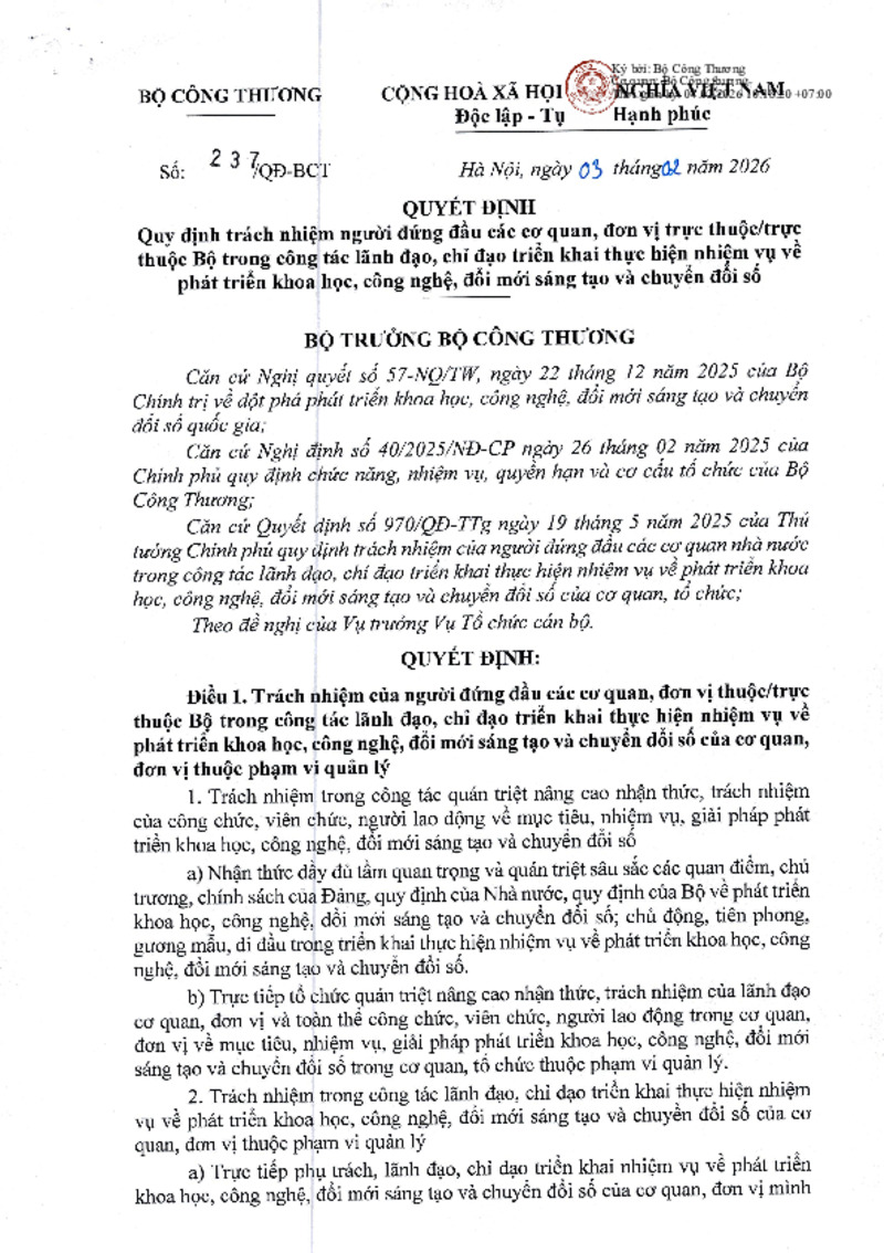 | Tiêu đề văn bản | Quyết định quy định trách nhiệm người đứng đầu các cơ quan, đơn vị trực thuộc/trực thuộc Bộ trong công tác lãnh đạo, chỉ đạo triển khai thực hiện nhiệm vụ về phát triển khoa học, công nghệ, đổi mới sáng tạo và chuyển đổi số | ||