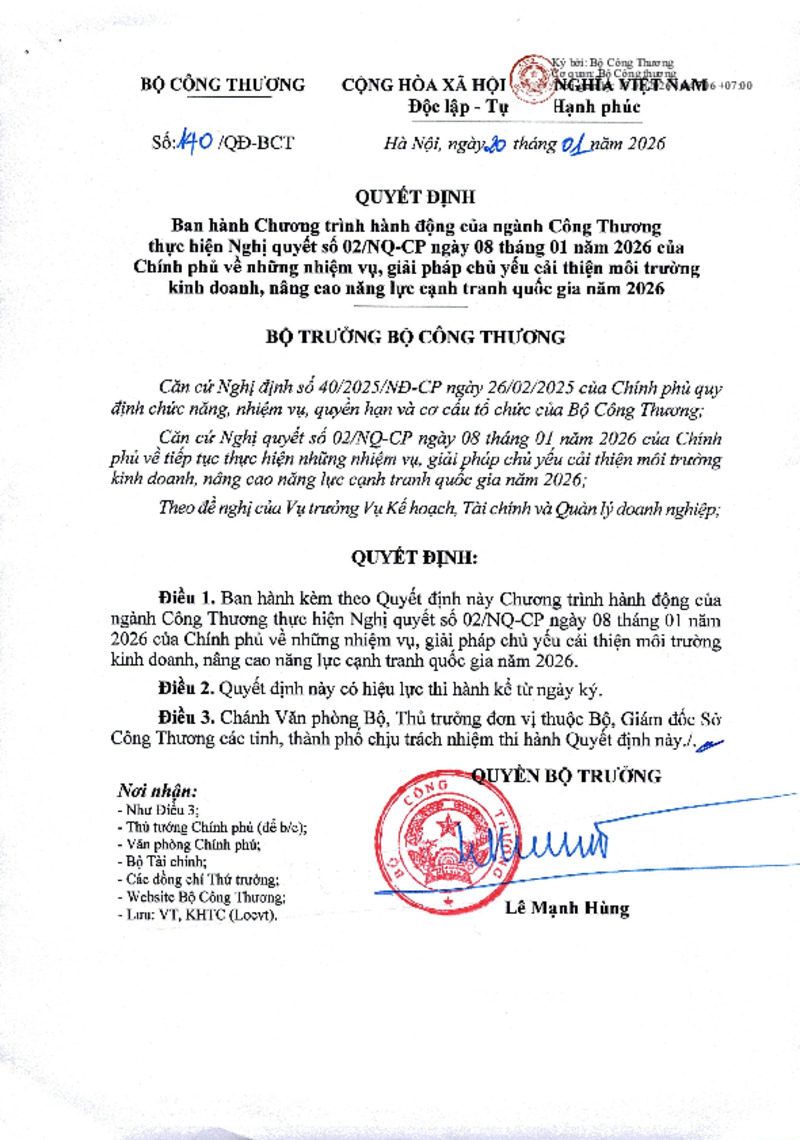 | Tiêu đề văn bản | Quyết định về việc Ban hành Chương trình hành động của ngành Công Thương thực hiện Nghị quyết số 02/NQ-CP ngày 8/1/2026 của Chính phủ về những nhiệm vụ, giải pháp chủ yếu cải thiện môi trường kinh doanh, nâng cao năng lực cạnh tranh quốc gia năm 2026 | ||