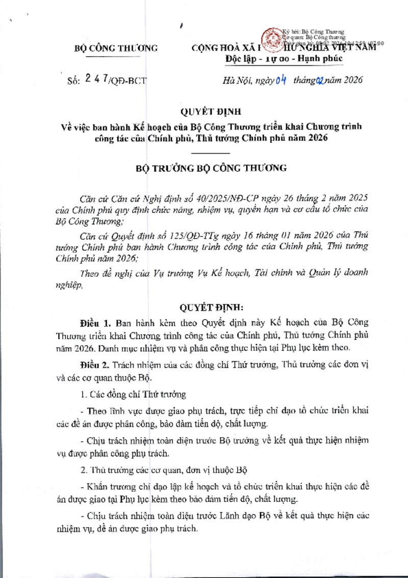 | Tiêu đề văn bản | Quyết định về việc ban hành Kế hoạch của Bộ Công Thương triển khai Chương trình công tác của Chính phủ, Thủ tướng Chính phủ năm 2026 | ||