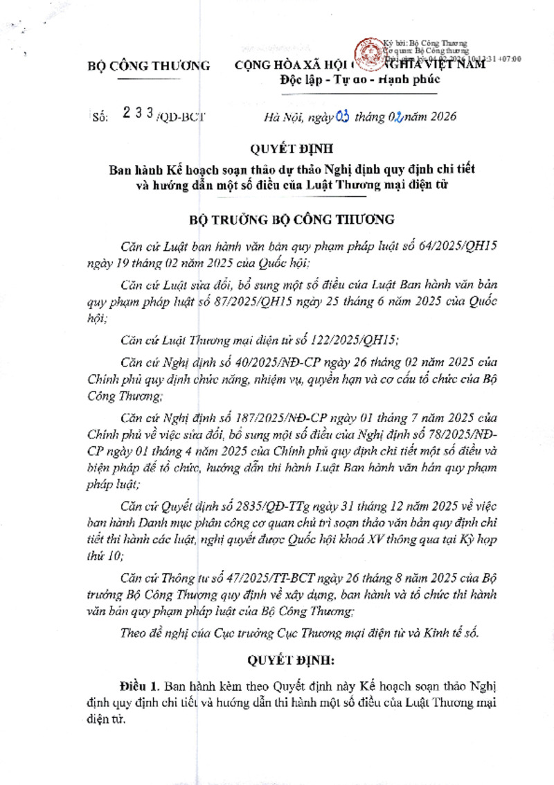 | Tiêu đề văn bản | Quyết định về việc ban hành Kế hoạch soạn thảo dự thảo Nghị định quy định chỉ tiết và hướng dẫn một số điều của Luật Thương mại điện tử | ||