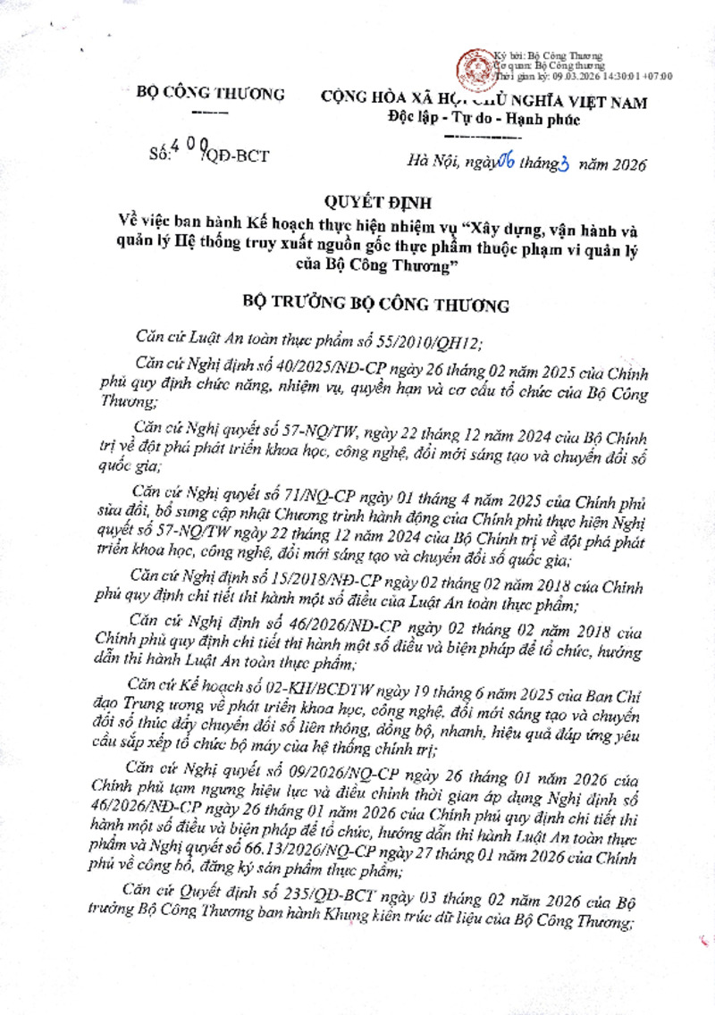 | Tiêu đề văn bản | Quyết định về việc ban hành Kế hoạch thực hiện nhiệm vụ "Xây dựng, vận hành và quản lý Hệ thống truy xuất nguồn gốc thực phẩm thuộc phạm vi quản lý của Bộ Công Thương" | ||