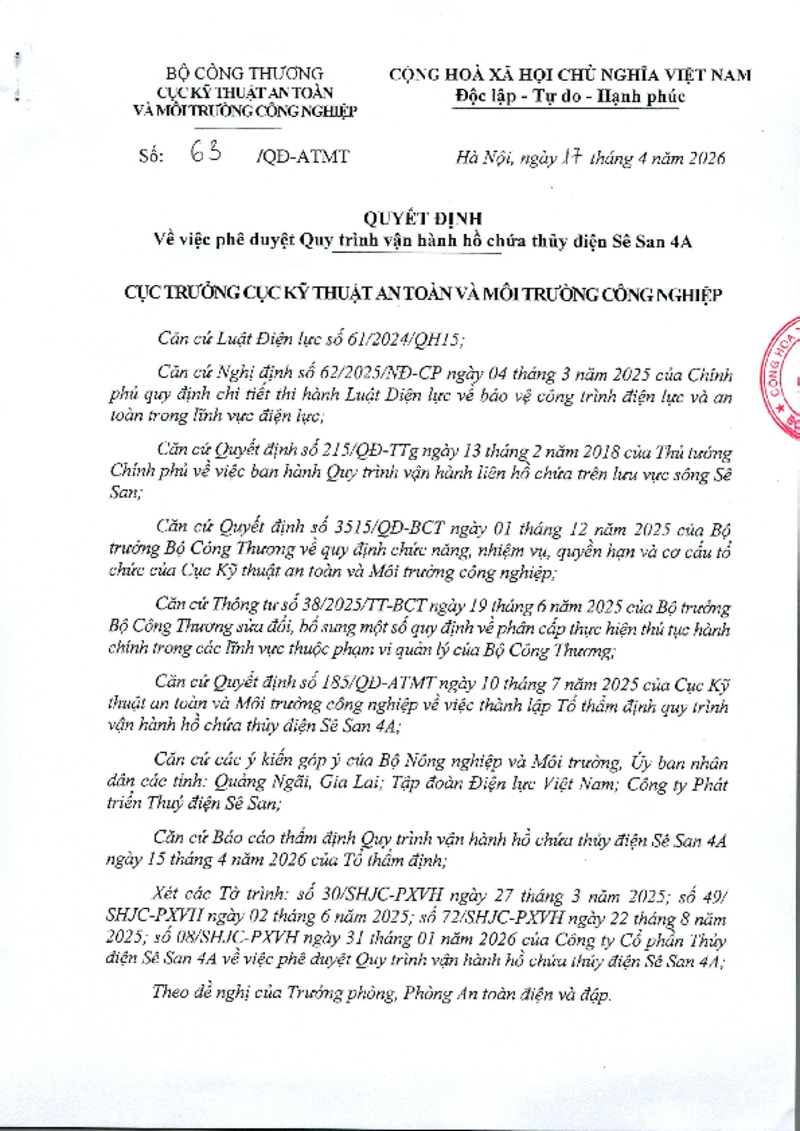 | Tiêu đề văn bản | Quyết định về việc phê duyệt Quy trình vận hành hồ chứa thủy điện Sê San 4A | ||