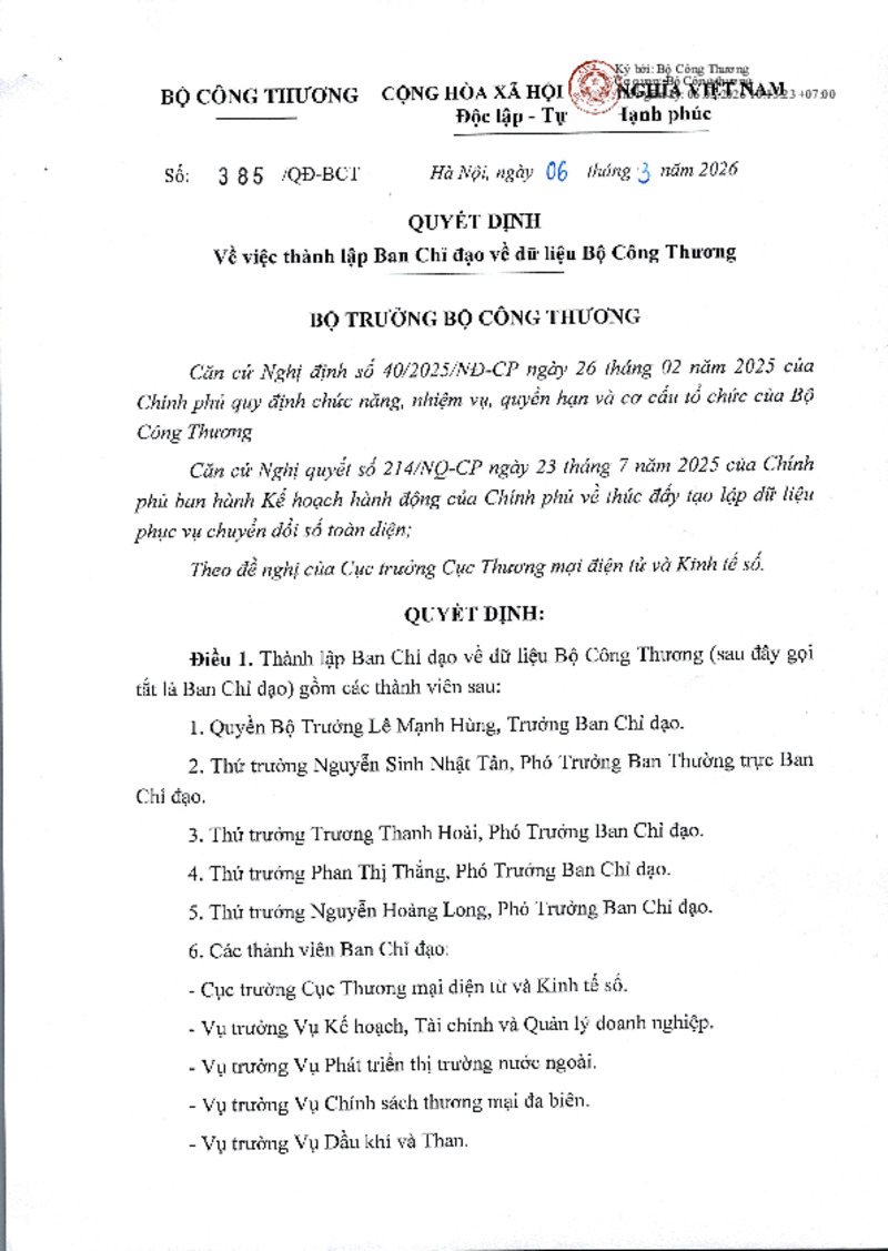 | Tiêu đề văn bản | Quyết định về việc thành lập Ban Chỉ đạo về dữ liệu Bộ Công Thương | ||