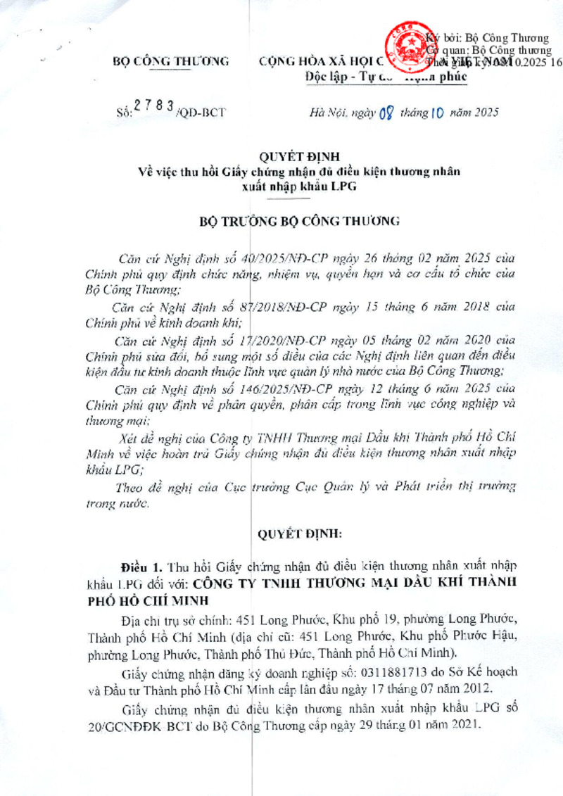 Tiêu đề văn bản | Quyết định về việc thu hồi Giấy chứng nhận đủ điều kiện thương nhân xuất nhập khẩu LPG | ||