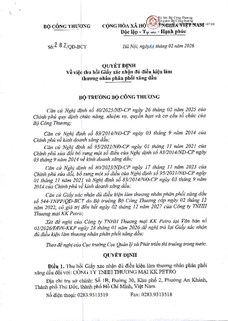 | Tiêu đề văn bản | Quyết định về việc thu hồi Giấy xác nhận đủ điều kiện làm thương nhân phân phối xăng dầu | ||