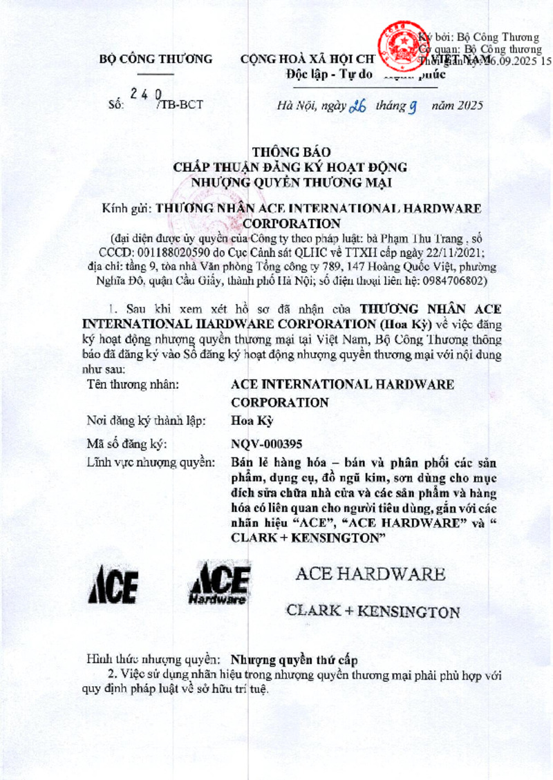 Tiêu đề văn bản | Thông báo chấp thuận đăng ký hoạt động nhượng quyền thương mại | ||
