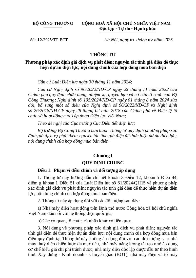 | Tiêu đề văn bản | Thông tư Phương pháp xác định giá dịch vụ phát điện; nguyên tắc tính giá điện để thực hiện dự án điện lực; nội dung chính của hợp đồng mua bán điện | ||