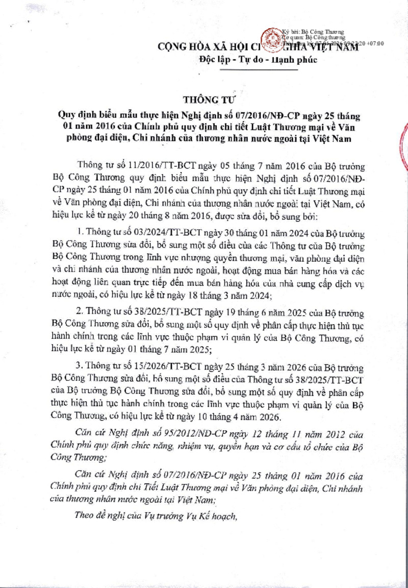 | Tiêu đề văn bản | Văn bản hợp nhất số 23 -Thông tư quy định biểu mẫu thực hiện Nghị định số 07/2016/NĐ-CP ngày 25 tháng 01 năm 2016 của Chính phủ quy định chi tiết Luật Thương mại về Văn phòng đại diện, Chi nhánh của thương nhân nước ngoài tại Việt Nam | ||
