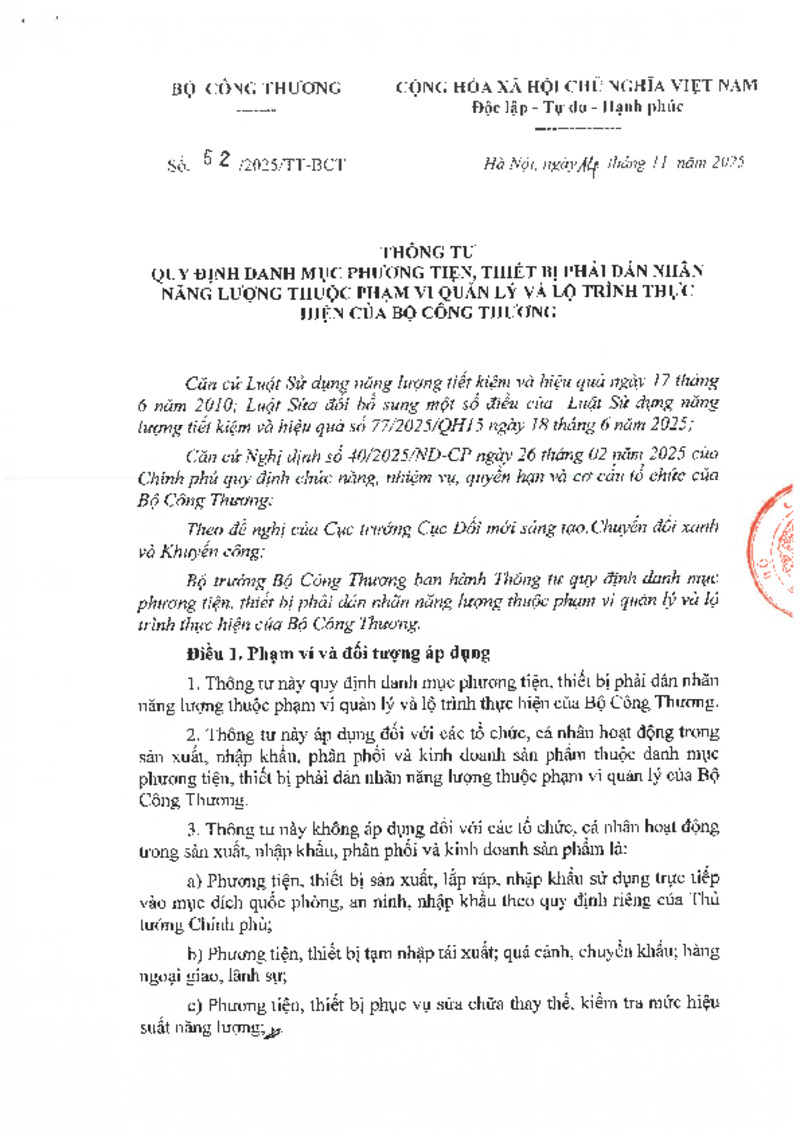 | Tiêu đề văn bản | Thông tư quy định danh mục phương tiện, thiết bị phải dán nhãn năng lượng thuộc phạm vi quản lý và lộ trình thực hiện của Bộ Công Thương | ||
