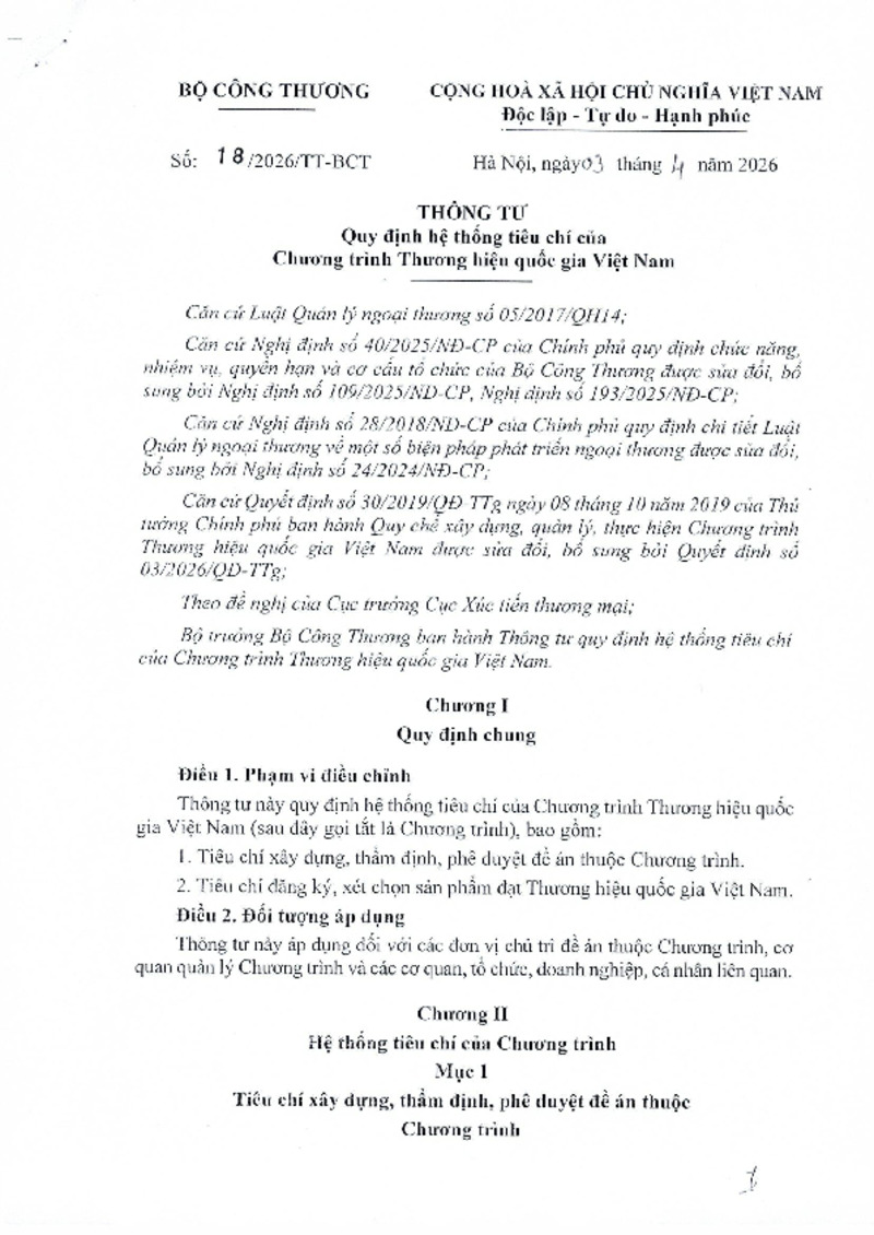 | Số hiệu | Số 18/2026/TT-BCT | Cơ quan ban hành | Bộ Công Thương |