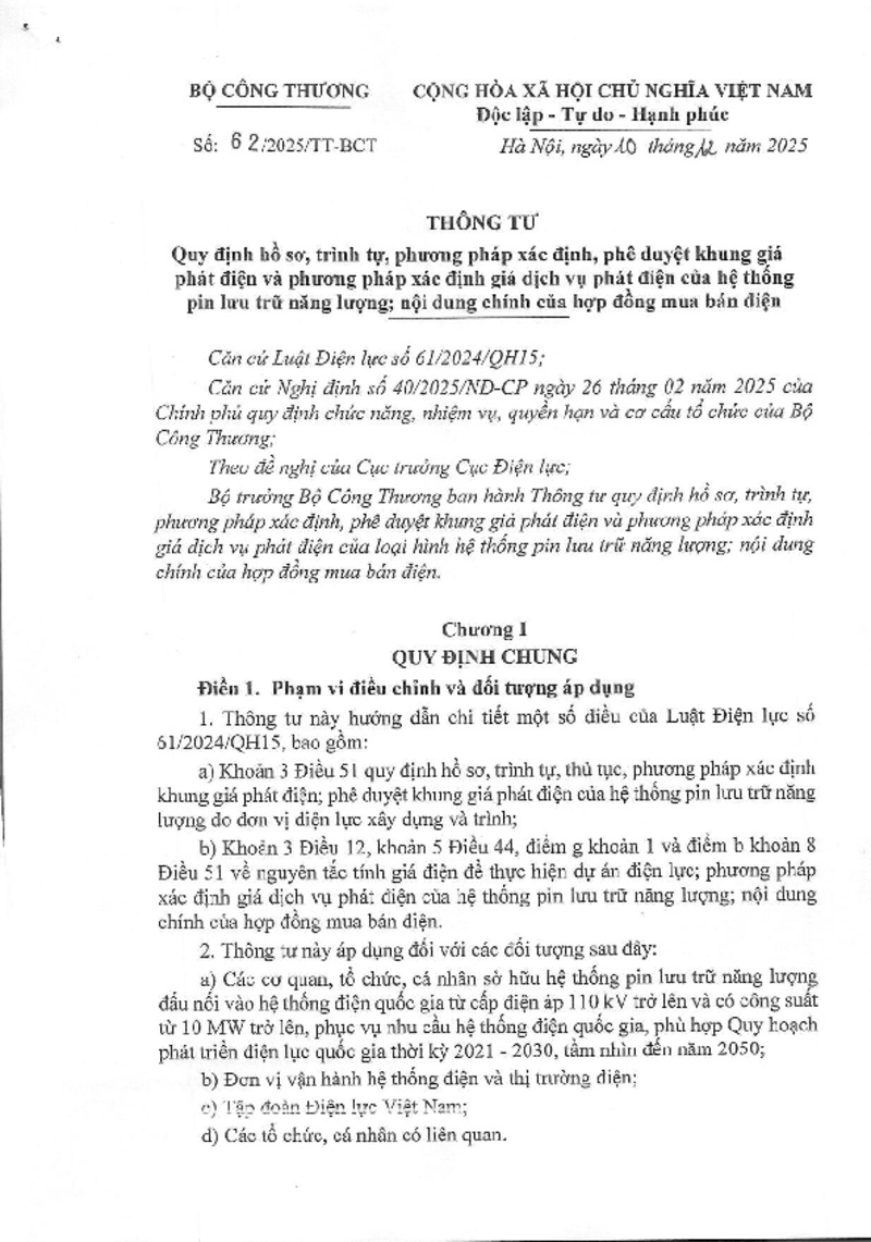 | Tiêu đề văn bản | Thông tư quy định hồ sơ, trình tự, phương pháp xác định, phê duyệt khung giá phát điện và phương pháp xác định giá dịch vụ phát điện của hệ thống pin lưu trữ năng lượng; nội dung chính của hợp đồng mua bán điện | ||