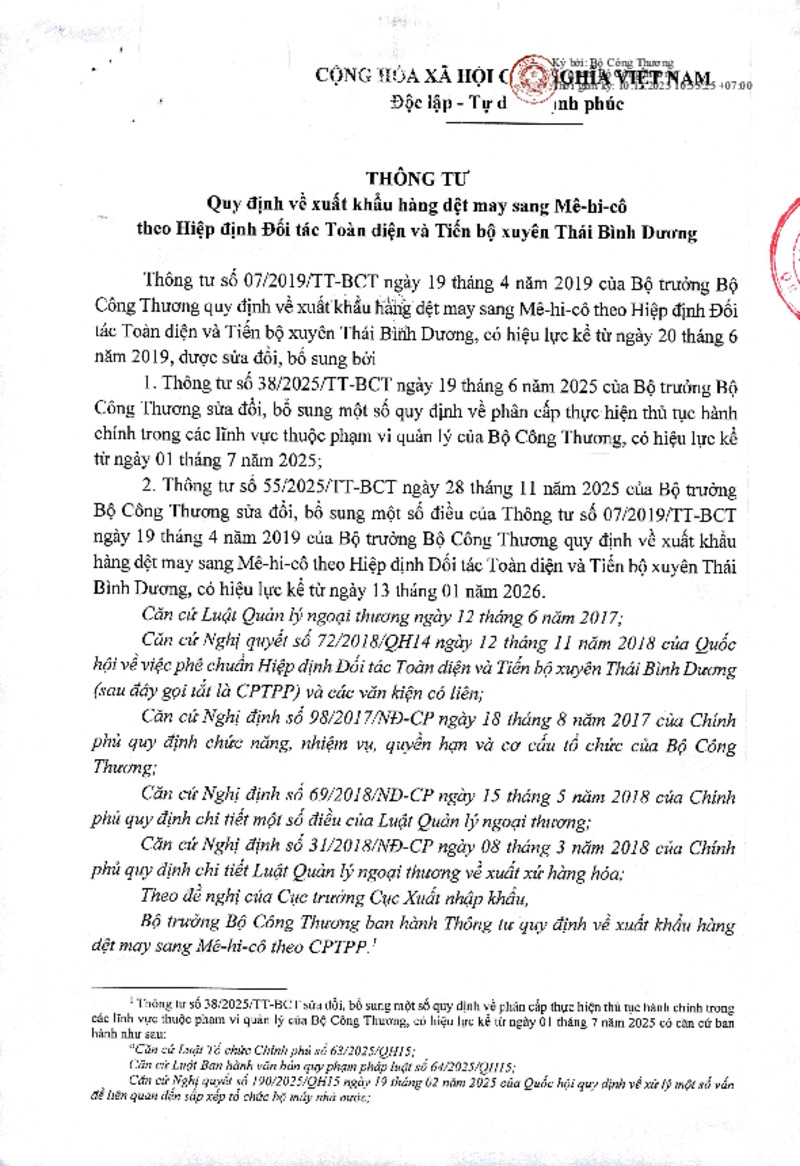 | Tiêu đề văn bản | Thông tư Quy định về xuất khẩu hàng dệt may sang Mê-hi-cô theo Hiệp định Đối tác Toàn diện và Tiến bộ xuyên Thái Bình Dương | ||