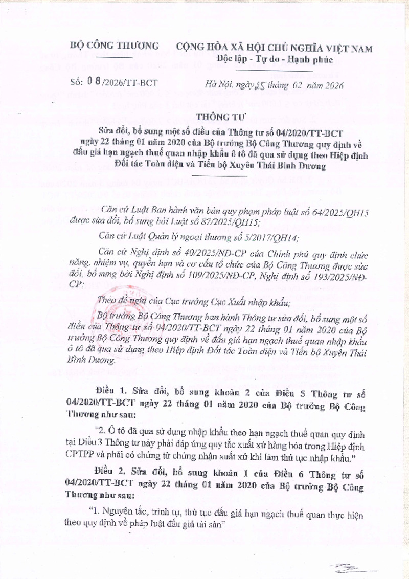 | Tiêu đề văn bản | Thông tư sửa đổi, bổ sung một số điều của Thông tư số 04/2020/TT-BCT ngày 22 tháng 01 năm 2020 của Bộ trưởng Bộ Công Thương quy định về đấu giá hạn ngạch thuế quan nhập khẩu ô tô đã qua sử dụng theo Hiệp định Đối tác Toàn diện và Tiến bộ Xuyên Thái Bình Dương | ||