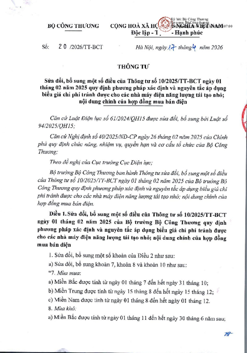 | Tiêu đề văn bản | Thông tư sửa đổi, bổ sung một số điều của Thông tư số 10/2025/TT-BCT quy định phương pháp xác định và nguyên tắc áp dụng biểu giá chi phí tránh được cho các nhà máy điện năng lượng tái tạo nhỏ; nội dung chính của hợp đồng mua bán điện | ||