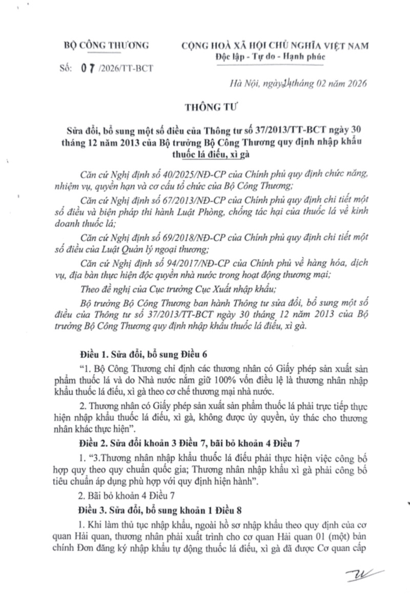 | Tiêu đề văn bản | Thông tư sửa đổi, bổ sung một số điều của Thông tư số 37/2013/TT-BCT ngày 30 tháng 12 năm 2013 của Bộ trưởng Bộ Công Thương quy định nhập khẩu thuốc lá điếu, xì gà | ||