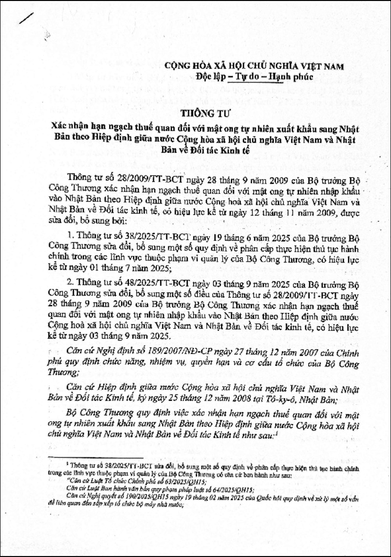 Tiêu đề văn bản | Thông tư về xác nhận hạn ngạch thuế quan đối với mật ong tự nhiên xuất khẩu sang Nhật Bản theo Hiệp định giữa nước Cộng hòa xã hội chủ nghĩa Việt Nam và Nhật Bản về Đối tác Kinh tế | ||
