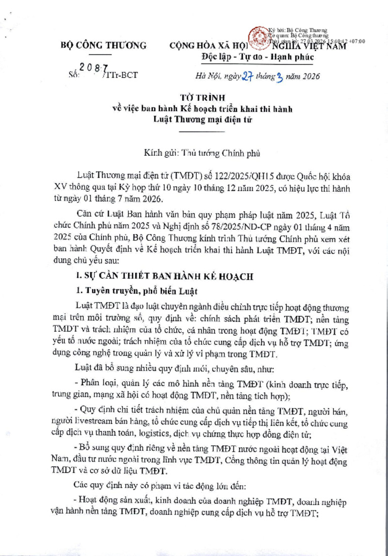 | Tiêu đề văn bản | Tờ trình về việc ban hành Kế hoạch triển khai thi hành Luật Thương mại điện tử | ||
