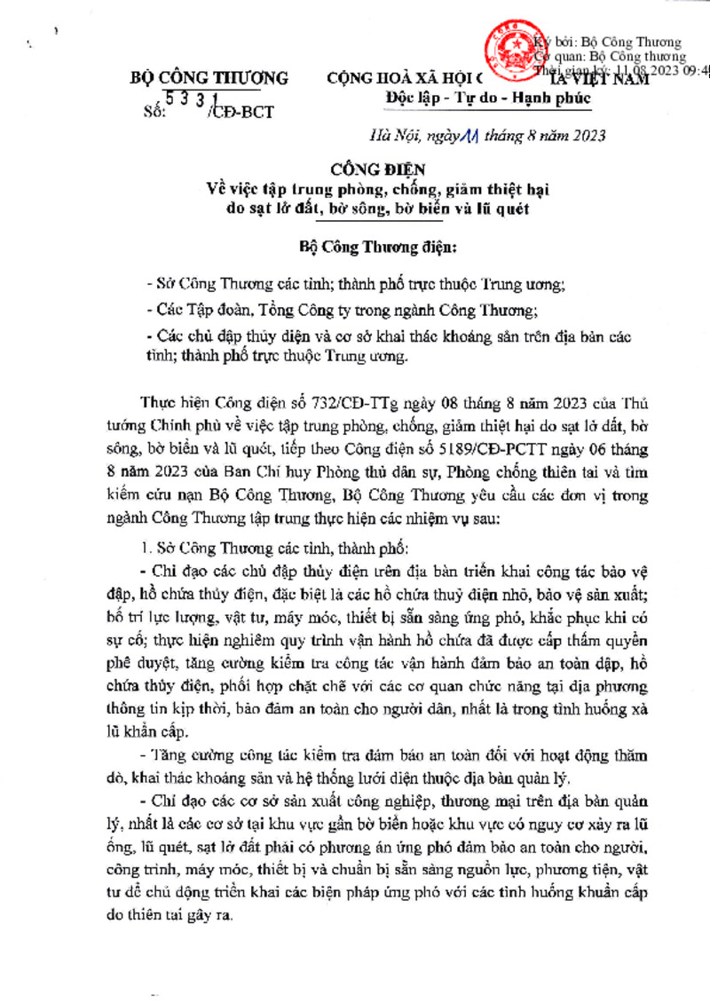 | Tiêu đề văn bản | Công điện về việc tập trung phòng, chống, giảm thiệt hại do sạt lở đất, bờ sông, bờ biển và lũ quét | ||