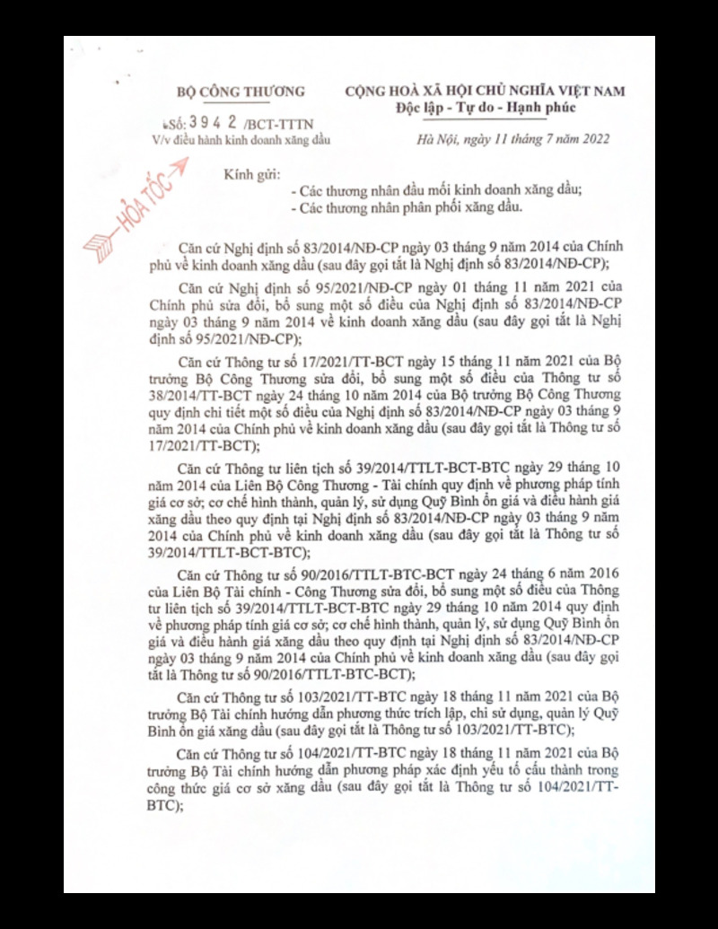 | Tiêu đề văn bản | Công văn về việc điều hành xăng dầu ngày 11/7/2022 | ||
