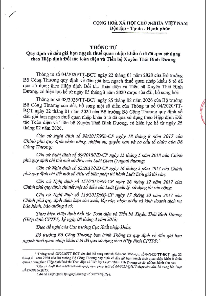 | Tiêu đề văn bản | Văn bản hợp nhất số 11/VBHN-BCT - Thông tư quy định về đấu giá hạn ngạch thuế quan nhập khẩu ô tô đã qua sử dụng theo Hiệp định Đối tác toàn diện và Tiến bộ Xuyên Thái Bình Dương | ||