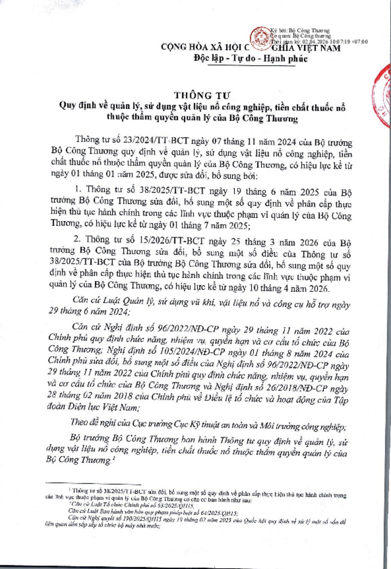 | Tiêu đề văn bản | Văn bản hợp nhất số 21- Thông tư Quy định về quản lý, sử dụng vật liệu nổ công nghiệp, tiền chất thuốc nổ thuộc thẩm quyền quản lý của Bộ Công Thương | ||