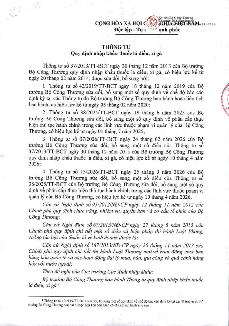 | Tiêu đề văn bản | Văn bản hợp nhất số 25 - Thông tư quy định nhập khẩu thuốc lá điếu, xì gà | ||