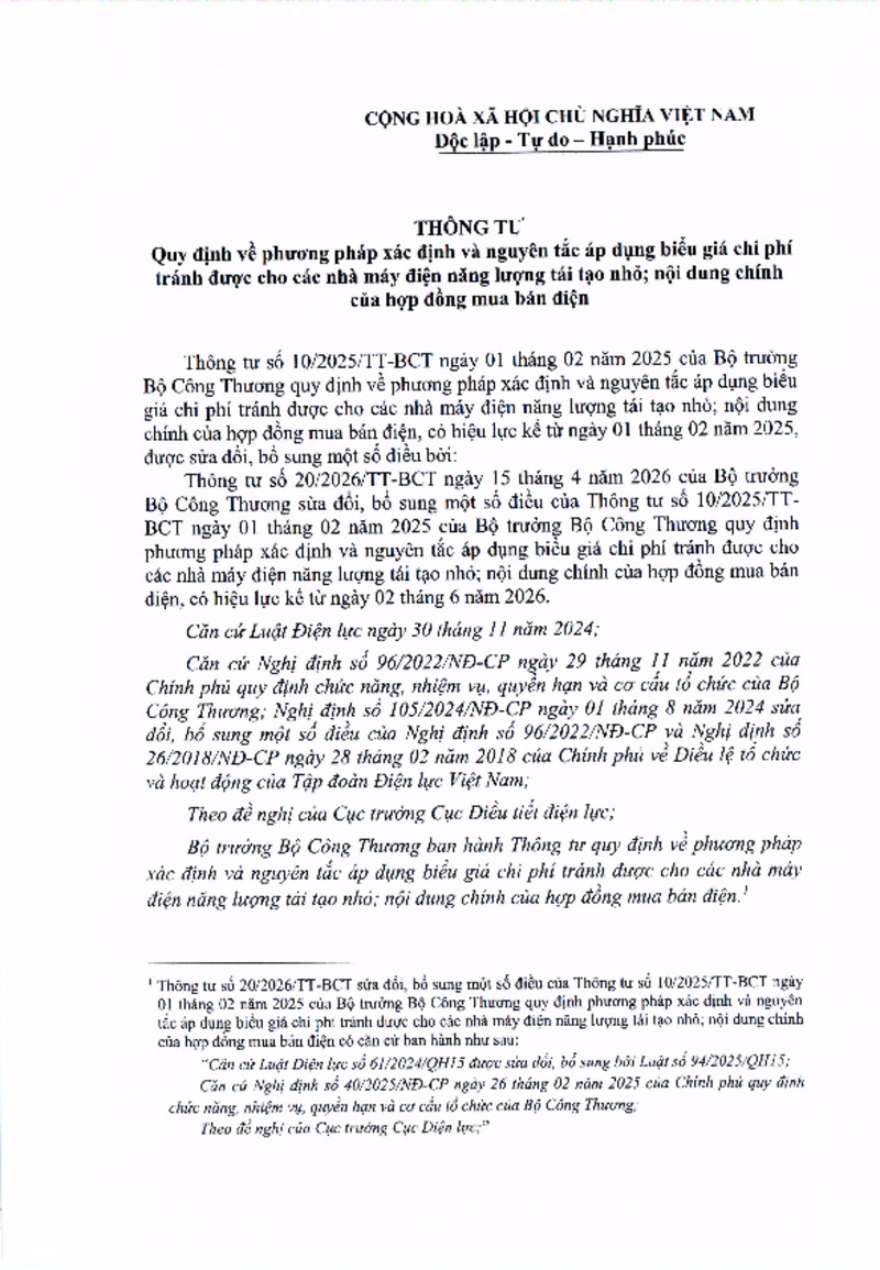 | Tiêu đề văn bản | Văn bản hợp nhất số 31 - Thông tư quy định về phương pháp xác định và nguyên tắc áp dụng biểu giá chi phí tránh được cho các nhà máy điện năng lượng tái tạo nhỏ; nội dung chính của hợp đồng mua bán điện | ||