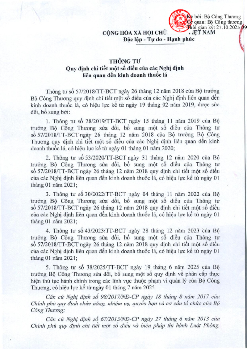 | Tiêu đề văn bản | Văn bản hợp nhất số 51/VBHN-BCT ngày 24/10/2025 - Thông tư quy định chi tiết một số điều của các Nghị định liên quan đến kinh doanh thuốc lá | ||